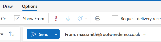 - In the new message area, click Options in the toolbar, then tick Show From. A From field will appear at the top of your message.