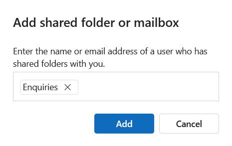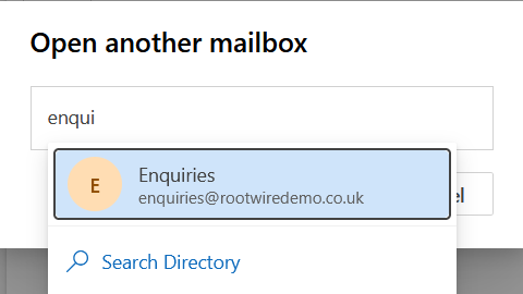 - Type the email address of the shared mailbox and select it from the results that appear.