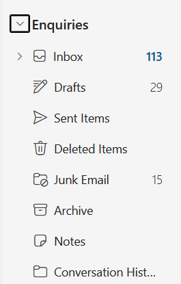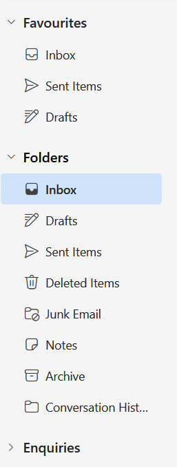 - The shared mailbox will now appear as a separate section in your left-hand panel.